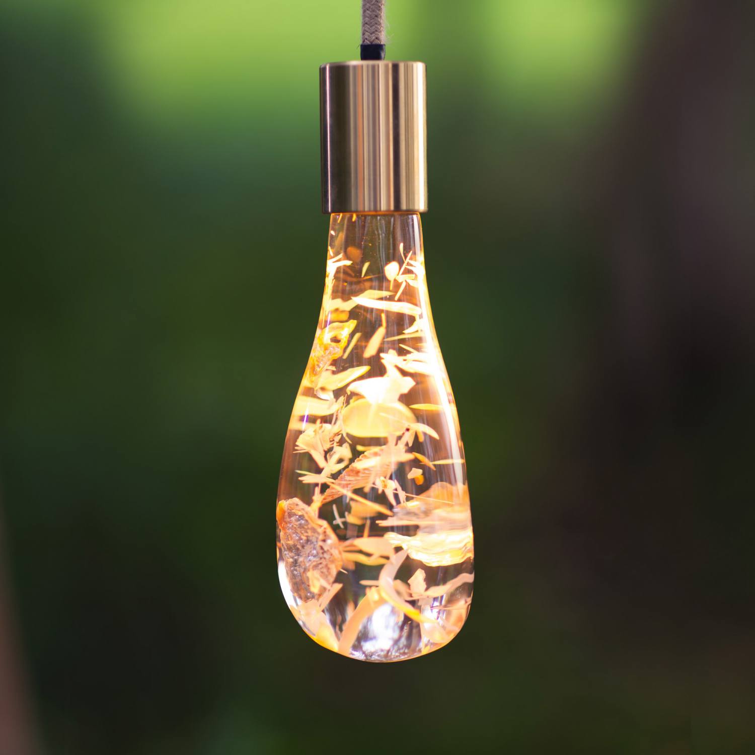 Clear Drops are hand formed resin pendants with shell or flower and seed heads set within. They are illuminated from a warm white led concealed within the brass light head. Now available in three sizes these beautiful pendants can be used inside or out. They are perfect as bedside lights, hung in groups over a dining table, hung from trees in a garden or as a larger scale piece in a restaurant or reception. Choose from nacre, razor shell shards, dried grasses or artichoke blossom.